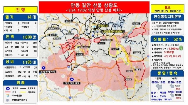 [안동=한국유통신문] 2025년 3월 27일 오전 10시 기준, 안동 지역에서 발생한 대형 산불이 4,500ha에 걸쳐 번지며 피해가 확산되고 있다. 현재까지 진화율은 52%를 기록하고 있으며, 대피 주민 수는 3,508명에 달한다.