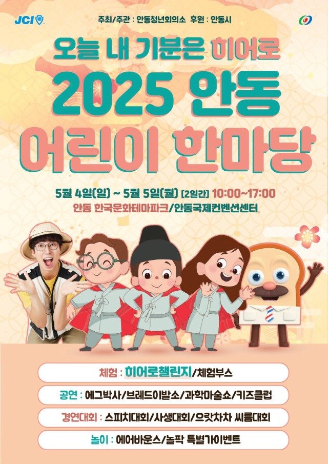 [안동= 한국유통신문] 김성원 기자= 안동시와 안동청년회의소(회장 손병현)는 제103회 어린이날을 맞아 오는 2025년 5월 4일(일)부터 5월 5일(월)까지 이틀간, 한국문화테마파크와 안동국제컨벤션센터 일대에서 ‘2025 안동 어린이 한마당’을 개최한다.