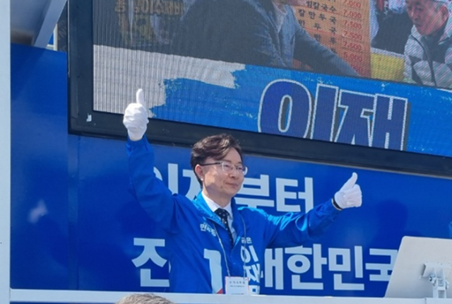 12일 더불어민주당 안동예천선거대책위원회 김상우 상임총괄선대위원장이 안동신시장에서 유세를 하고 있다.