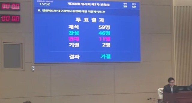 경북도의회는 28일 제360회 임시회 본회의에서 대구‧경북 행정통합에 관한 의견제시안을 표결에 부쳐 찬성 46명, 반대 11명, 기권 2명으로 가결했다. 이는 2024년 대구시의회의 통합동의 이후 경북도의회까지 공식 절차를 마무리한 것으로, 행정통합이 국회의 특별법 입법 단계로 본격 진입하는 중대한 전환점으로 평가된다.