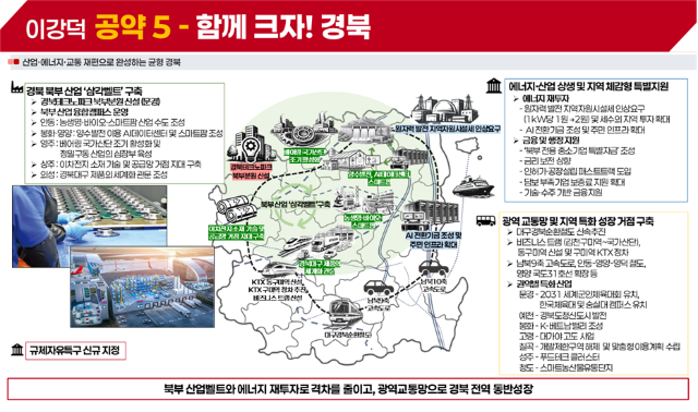 시·군별 맞춤 특화사업도 구체화했다. 문경 2031 세계군인체육대회 유치, 예천 경북도청신도시 발전, 봉화 K-베트남 밸리, 고령 대가야 고도 사업, 칠곡 개발제한구역 해제, 청도 스마트 농산물 유통단지, 성주 푸드테크클러스터 등을 통해 지역 강점을 극대화한다. 규제자유특구 확대와 공장 설립 패스트트랙, 북부 전용 중소기업 특별자금 등 지원책도 병행한다.