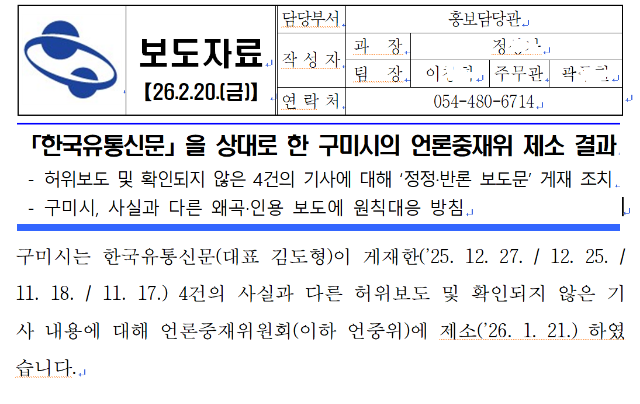 [한국유통신문= 김도형 기자] 구미시가 최근 한국유통신문을 상대로 진행한 언론중재위원회(이하 언중위) 제소 결과에 대해  보도자료(2026.2.20)를 배포하며 '가짜뉴스'와 '허위보도'라는 표현을 사용했으나, 정작 이 과정에서 자치단체장 보고 등 공식적인 결재 절차를 건너뛰고 홍보부서 단독 판단으로 배포한 사실이 드러나 행정 절차의 정당성 논란이 일고 있다.