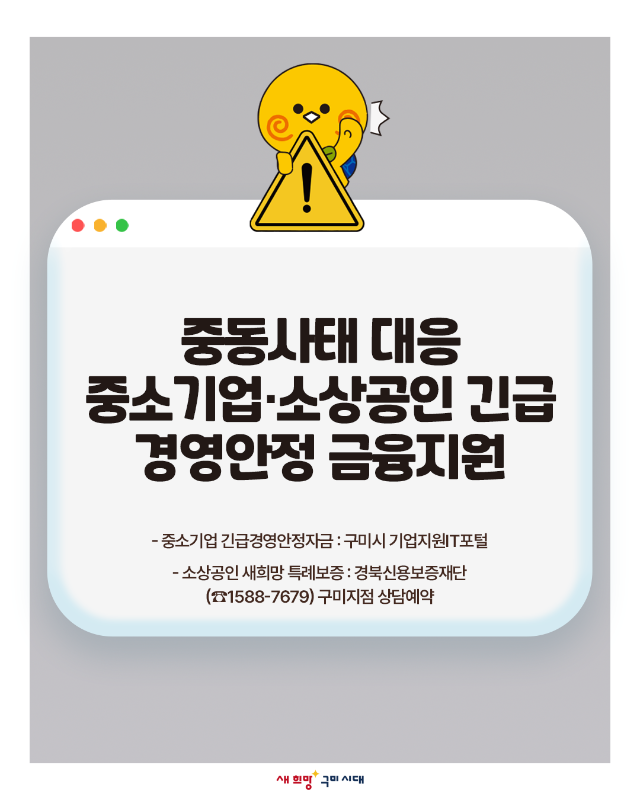 [한국유통신문= 김도형 기자] 구미시는 중동 지역 정세 불안과 글로벌 공급망 차질, 원자재 가격 상승 등으로 인해 경영 애로가 우려되는 지역 중소기업과 소상공인을 지원하기 위해 ‘긴급 경영안정 금융지원’을 추진한다고 23일 밝혔다.
