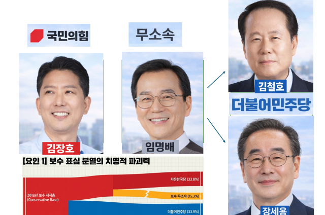 지역 내 불통 행정 논란과 공천 과정의 불투명성이 부각될 경우, 20%를 상회하는 무당층이 기성 정당이 아닌 무소속이나 민주당으로 급격히 이동할 위험이 있다. 시나리오별 가상 판세 분석보수 지지층이 하나로 결집할 경우 민주당 후보가 승리하기 위해서는 50% 이상의 득표가 필요해 사실상 당선이 어렵다. 그러나 3자 구도가 형성되면 상황은 반전된다.