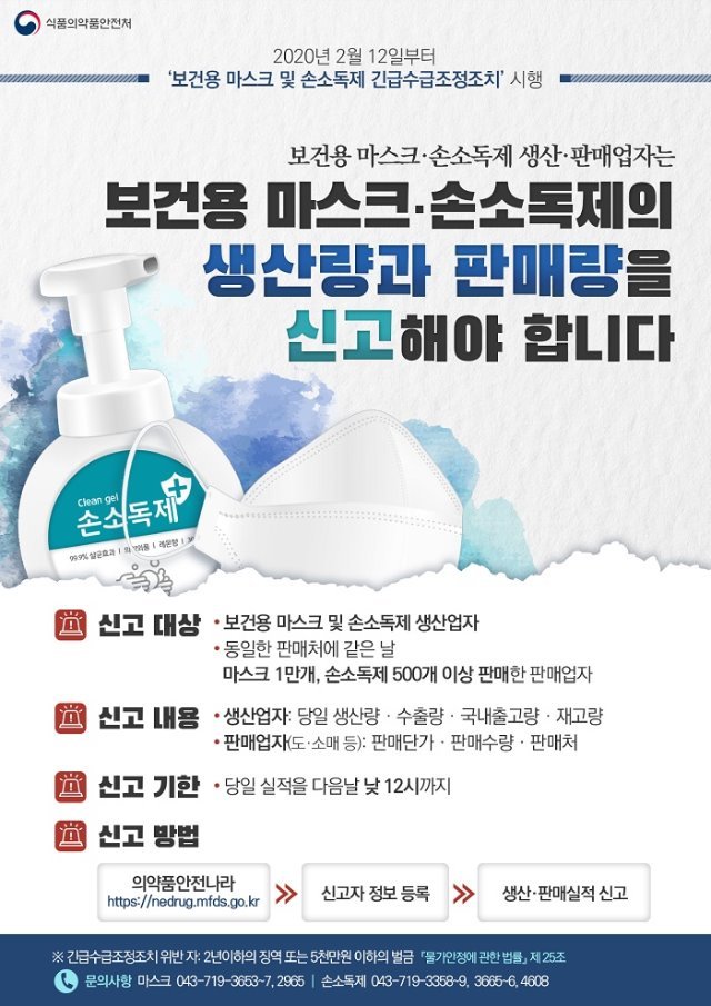 보건용 마스크 생산업자는 긴급수급조정조치 시행에 따라 2월 12일부터 당일 생산·출고량 등을 다음날 낮 12시까지 식품의약품안전처에 신고해야 한다. 이로 인해 마스크 생산업체의 생산·출고량 등을 보다 정확하게 파악할 수 있게 됐다.