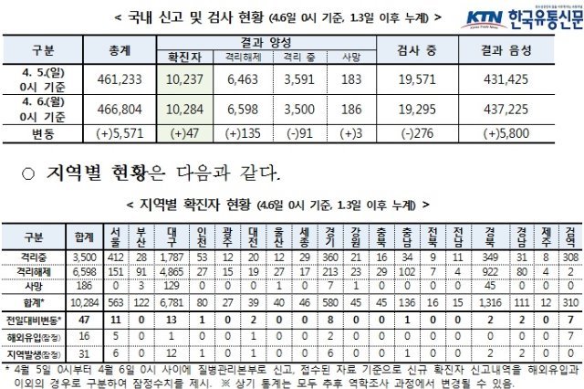 (전국= KTN) 김도형 기자= 질병관리본부 중앙방역대책본부(본부장 정은경)는 4월 6일 0시 현재, 총 누적 확진자수는 10,284명(해외유입 769명*(내국인 92.2%))이며, 이 중 6,598명(64.2%)이 격리해제 되었다고 밝혔다. 신규 확진자는 47명이고, 격리해제는 135명 증가하여 전체적으로 격리 중 환자는 감소했다고 밝혔다.