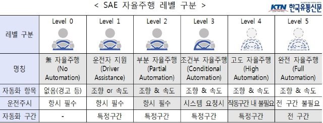* 자율주행차는 미국 SAE(미국자동차 기술자 협회) 기준으로 레벨 0∼5까지 구분되어 있으며, HDA(고속도로 운전 보조) 장치의 수준은 자율주행 레벨 2단계에 해당