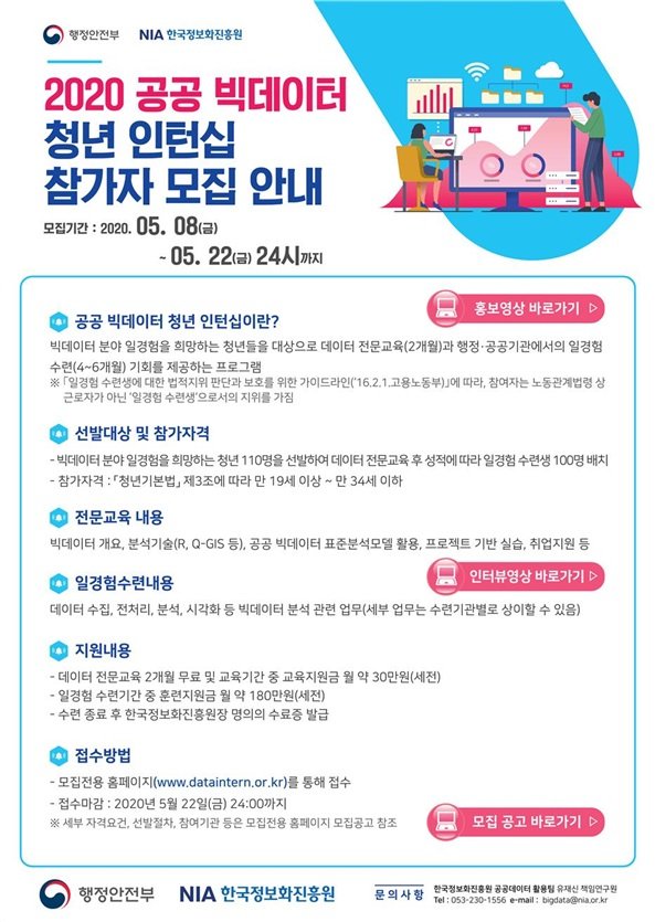 데이터 분석 전문가를 꿈꾸는 청년들은 ‘공공 빅데이터 인턴십 누리집(http://www.dataintern.or.kr)’에서 지원 자격과 모집 일정을 확인하고, 5월 8일부터 22일까지 신청 할 수 있다.