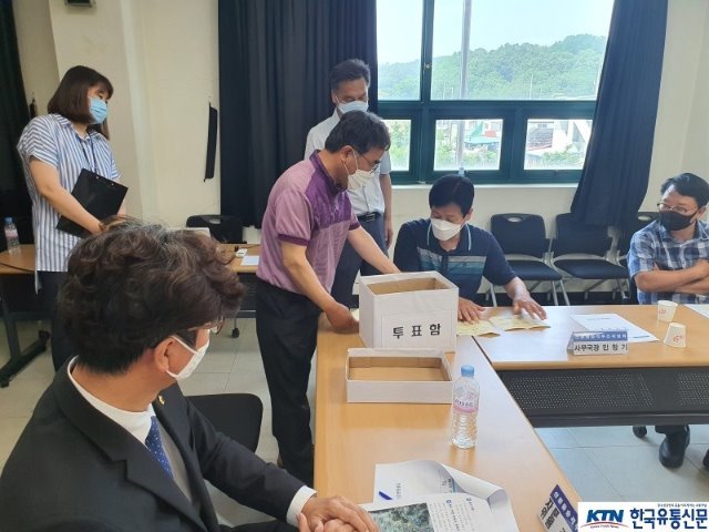 산동읍청사 부지 선정 투표함 개표 중인 산동읍승격추진위원회 선관위(사진 박용철 부위원장 제공)