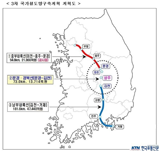 문경~상주~김천 구간은 고속화전철인 중부내륙철도(서울 수서~문경)와 남부내륙철도(김천~경남 거제)를 연결하는 사업이다. 국토의 중심을 남북으로 연결하는 철도 노선이지만 문경~상주~김천 구간(73㎞)만 미연결 상태로 남아 있다.