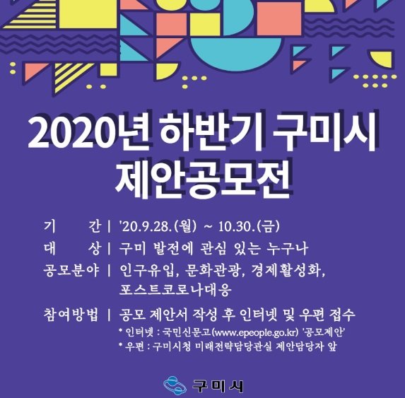 (전국= KTN) 김도형 기자= 구미시(시장 장세용)는 시민의 행복 증진과 지역 발전을 위한 참신한 아이디어를 발굴하고 시정에 반영하고자 오는 9월 28일부터 10월 30일까지 5주간 ‘2020년 하반기 구미시 제안공모전’을 개최한다.