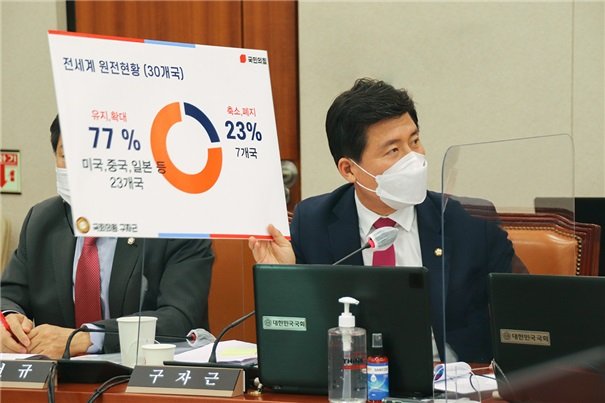 구 의원은 과기부의 원자력산업 실태조사 보고서를 공개하고 현행 원전 운영국 총 30개국 중에서 향후 유지 및 확대정책은 미국, 중국, 일본 등 23개국(77%)에 달하며 축소와 폐지는 합쳐서 7개국(23%)에 불과하다는 점을 지적했다.