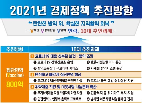 이를 위해 탄탄한 방역 아래 확실한 지역활력 회복을 목표로 집단면역(Vaccine), 경제반등(V sharp rally), 활력회복(Vitality)의 3대 전략, 10대 과제를 역점 추진하여 민생경제 부활에 사활을 건다.