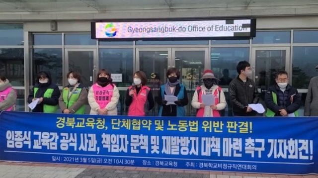 (전국= KTN) 김도형 기자= 5일 경북학교비정규직연대회의(이하 학비연대회의)는 경북교육청사에서 "경북교육청, 단체협약 및 노동법 위반 판결!"에 대해 임종식 교육감의 공식 사과와 함께 책임자 문책 및 재발방지 대책 마련을 촉구하는 기자회견을 열었다.