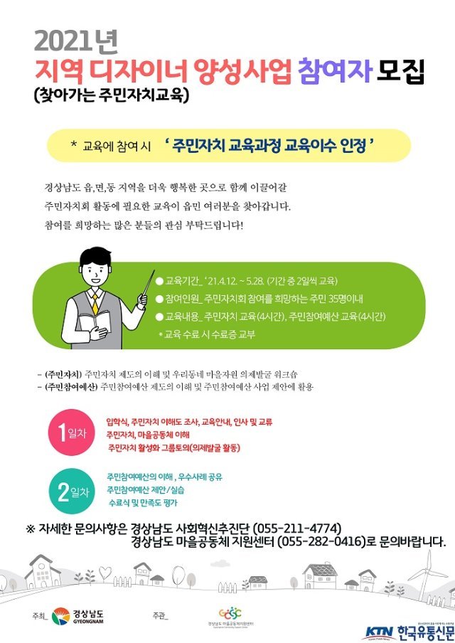 (전국= KTN) 김도형 기자= 경상남도(도지사 김경수)는 12일 창녕군을 시작으로 다음달까지 주민자치위원회를 주민자치회로 전환할 예정인 7개 시군 12개 읍면동에서 ‘지역디자이너 양성사업’을 진행한다고 밝혔다.