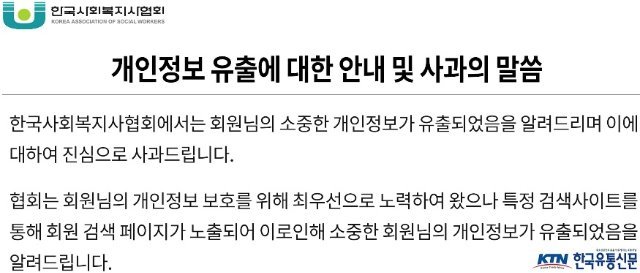 (전국= KTN) 김도형 기자= 23일 한국사회복지사협회에서는 2021년 4월 21일 발생한 개인정보 유출에 대한 안내와 사과의 말을 전했다.