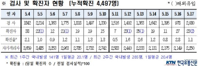 (전국= KTN) 김도형 기자= 경상북도에서는 5. 17.(월) 코로나19 확진자 23명(국내 21, 해외 2)이 신규 발생하였다.