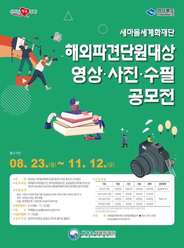 공모분야는 영상, 사진, 수필 등 3개 부문이며, 각 부문 대상에게는 상금과 경상북도지사 표창, 최우수상·우수상·장려상에게는 상금과 새마을세계화재단 대표이사 표창을 수여한다.