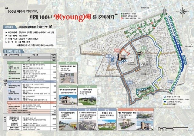영덕군은 영해면 성내리 일원에(150,000㎡) 3.1만세시장 주변 및 예주읍성일원의 지역자산을 활용한 거리정비, 창업상권활성화 센터, 공동체 활성화를 위한 어울림센터 조성을 통해 도시활력과 공동체 회복을,