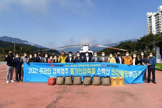 ‘소백산 인삼씨뿌리기 퍼포먼스’는 헬기 1대가 풍기읍 남원천 소무대 앞에서 출발해 연화봉과 비로봉 방면으로 비행하며 인삼씨앗 총 8포 480kg를 공중에서 살포했다.