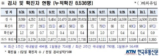 경북도내, 10월 2일 코로나19 확진자 97명(국내 96, 해외 1) 발생