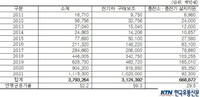 정부가 전기차 보급을 위한 예산을 지원하기 시작한 2011년부터 2021년 현재까지 차량구매보조와 충전소 설치 지원 예산의 총액은 3조 7,933억원에 달하는 것으로 나타났다. 이 중에서 차량 구매보조를 위한 예산(구매보조금)이 총 3조 1,244억원, 충전소 및 충전기 설치 지원을 위한 예산이 총 6,689억원에 달했다.