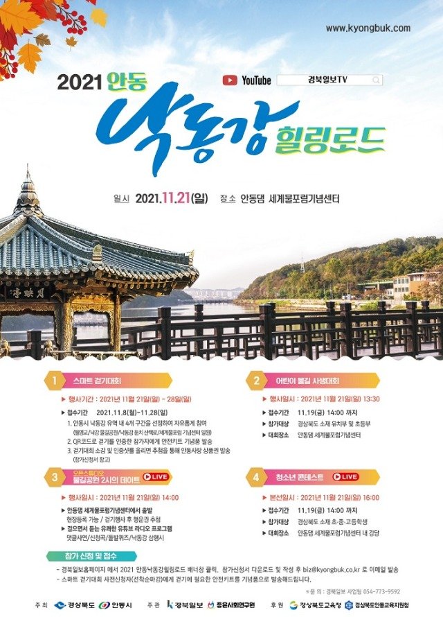 (전국= KTN) 김도형 기자= 경상북도와 안동시가 주최하고 경북일보(주)가 주관하는 「2021 안동 낙동강 힐링로드」가 다가오는 11월 21일(일) 월영교, 낙강물길공원 및 세계물포럼 기념센터 일원에서 개최된다.