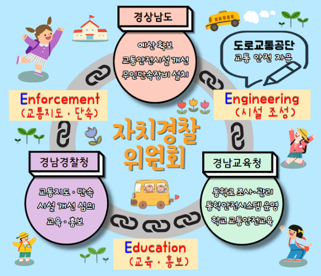 지난 5월 경상남도자치경찰위원회 출범 후 1호 사업으로 선정한 ‘집에서 학교까지 안전한’ 어린이 통학로 개선사업은 도 교통정책과-경남경찰청-경남교육청-도로교통공단 등 관계기관이 합동으로 어린이 교통사고 매년 10% 감소를 목표로 어린이 통학로 조성 3e를 전개하고 있다.
