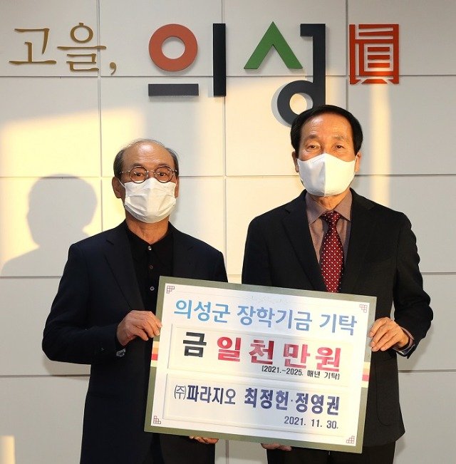 또한, ㈜파라지오는 2021년부터 2025년까지 매년 1천만원씩 총 5천만원의 장학금 기탁을 약속하며 “의성을 이끌어 나갈 인재양성에 힘을 보태고자 기탁하게 되었습니다. 지역발전의 중추적인 역할인 지역인재들이 꿈을 펼칠 수 있도록 지속적인 지원을 부탁드립니다.”라고 기탁소감을 밝혔다.