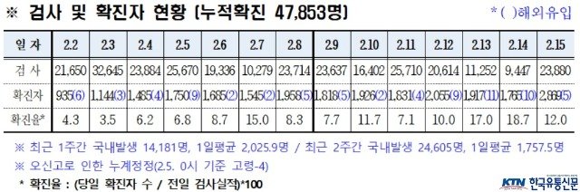 (전국= KTN) 김도형 기자= 경상북도에서는 2월 15일(화) 23개 시·군(시 10, 군 13)에서 코로나19 확진자 국내감염 2863명, 해외감염 6명이 신규 발생했다.