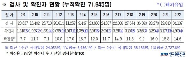 (전국= KTN) 김도형 기자= 경상북도에서는 2월 22일(화) 23개 시·군(시 10, 군 13)에서 코로나19 확진자 국내감염 4992명, 국외감염 4명이 신규 발생했다.