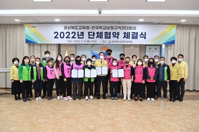 (전국= KTN) 김도형 기자= 전국학교비정규직연대회의(전국학교비정규직노동조합, 공공운수사회서비스노동조합 교육공무직본부, 전국여성노동조합, 이하 연대회의)와 경상북도교육청은 2022년 03월 14일 (월) 오후 2시에 경상북도교육청 화백관에서 단체협약을 체결하였다.