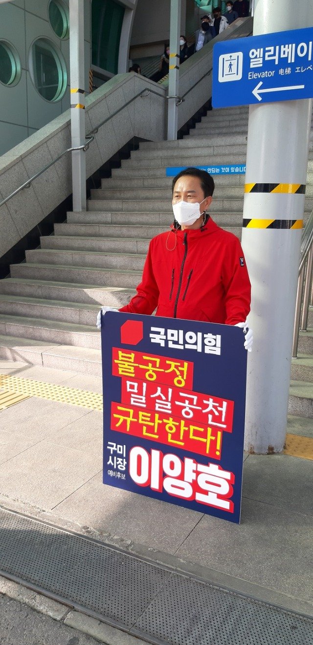 이양호 국민의힘 구미시장 예비후보 ‘밀실, 야합 공천 철회’1인시위 돌입