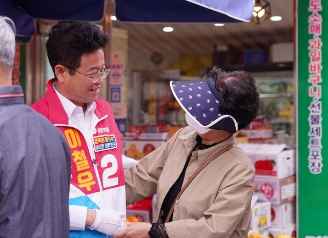 이철우 후보는 이날 자신의 고향인 김천의 대표적 전통시장인 황금시장과 평화시장을 돌며 자신을 비롯한 시장과 광역 의원 등 국민의힘 소속 후보들의 지지를 호소했다.