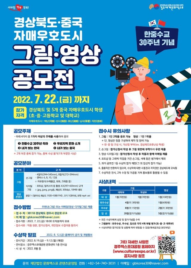 이영석 경북도 일자리경제실장은 “이번 공모전을 통해 경북도와 중국 자매우호도시 교류가 더욱 활성화되길 바라며, 지역 학생들의 적극적인 참여를 통해 풍성한 한중 수교 30주년 축하 행사가 되길 기대한다”고 밝혔다.