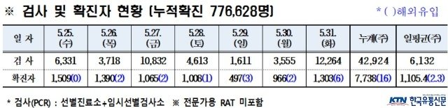 경북도내, 5월 31일 코로나19 확진자 1, 303명(국내 1, 297, 국외 6) 발생