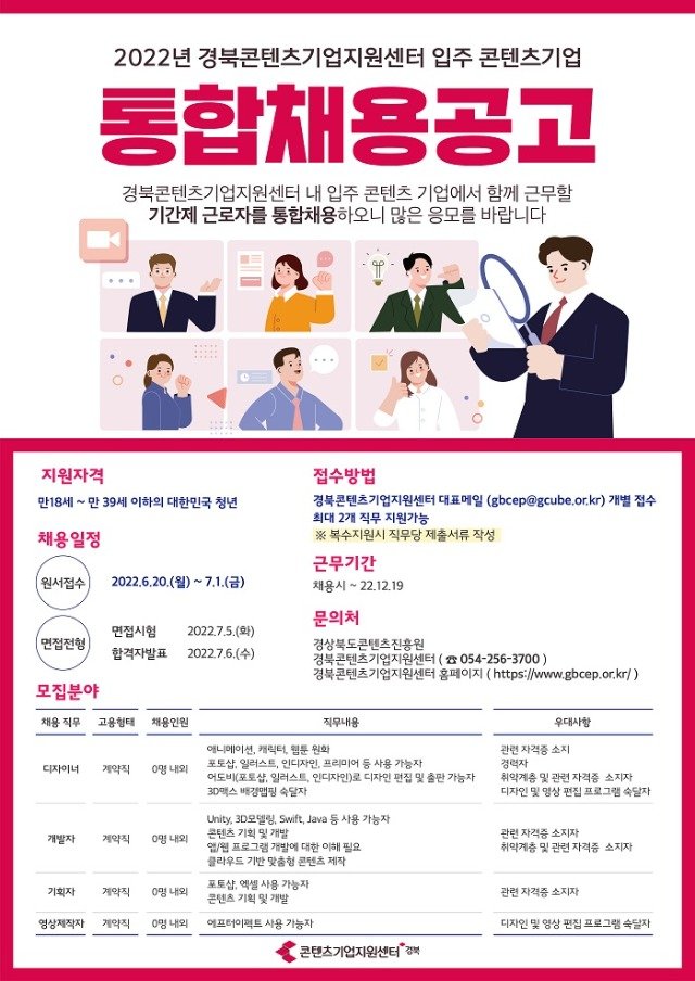 모집 부문은 △콘텐츠 기획자 △콘텐츠 디자이너 △앱/웹 프로그램 개발자 △영상제작자 등이다. 신청을 희망하는 구직자를 대상으로 다음달 1일까지 온라인을 통해 원서접수를 받는다. 자세한 신청 방법은 경북콘텐츠기업지원센터 홈페이지( https://www.gbcep.or.kr/)에서 확인 가능하다.