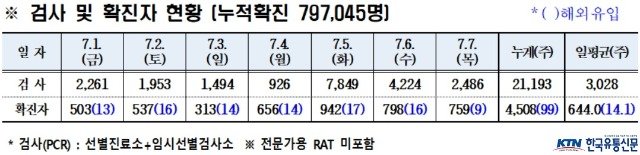 경북도내, 7월 7일 코로나19 확진자 759명(국내 750, 국외 9) 발생
