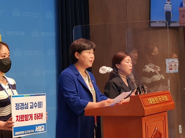 서영교 후보는 지난 23일 기자회견을 열어 “사람의 건강과 생명조차도 정치적으로 이용하는 윤석열 정권의 정치보복이 개탄스럽다”고 지적하고 “정경심 교수 형집행정지를 즉각 수용하여 치료할 기회를 달라”고 촉구했다.
