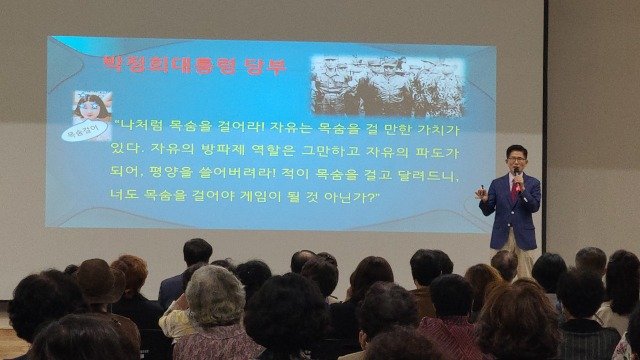 김문수 전 지사는 박정희 전 대통령의 탄생에 얽힌 일화를 시작으로 새마을운동의 시작 배경을 비롯해 산업혁명가 박정희에 대한 업적을 총망라하며 흥미로운 강연을 펼쳤다.