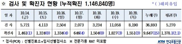 경북도내, 10월 20일 0시 기준 코로나19 확진자 1, 551명(국내 1, 548, 국외 3) 발생