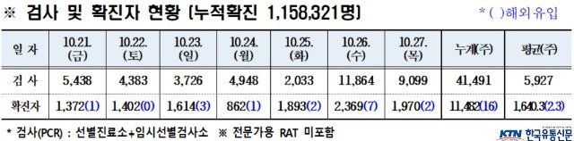 경북도내, 10월 27일 0시 기준 코로나19 확진자 1, 970명(국내 1, 968, 국외 2) 발생