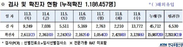 경북도내, 11월 9일 0시 기준 코로나19 확진자 3, 128명(국내 3, 122, 국외 6) 발생