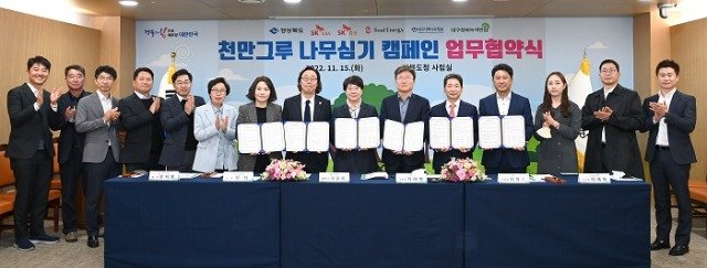 경북도는 15일 도청 회의실에서 SK E&S, SK증권, 소울에너지, 대구경북기자협회, 대구경북녹색연합과 「천만그루 나무심기 캠페인」업무협약을 체결했다.