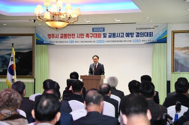 (전국= KTN) 김도형 기자= 영주시(시장 박남서)는 15일 그랜드컨벤션웨딩에서 영주시 교통장애인협회 회원 등 200여 명이 참석한 가운데 ‘2022년 교통안전 시민촉구대회 및 교통사고예방 결의대회’를 개최했다.