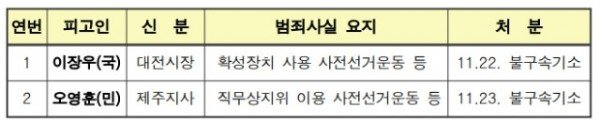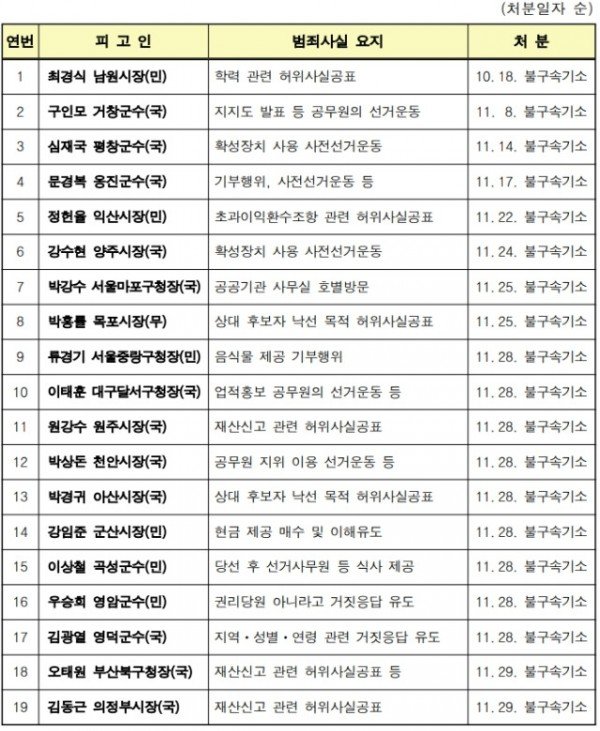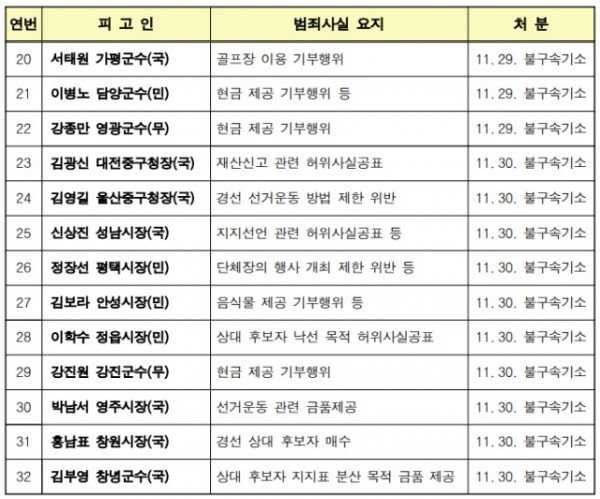 당선자는 광역자치단체장 2명, 기초자치단체장 32명, 광역의원 20명, 기초의원 78명, 교육감 2명 등 총 134명을 기소했다.