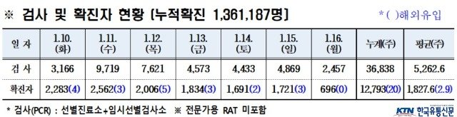 경북도내, 1월 16일 0시 기준 코로나19 확진자 696명(국내 696, 국외 0) 발생
