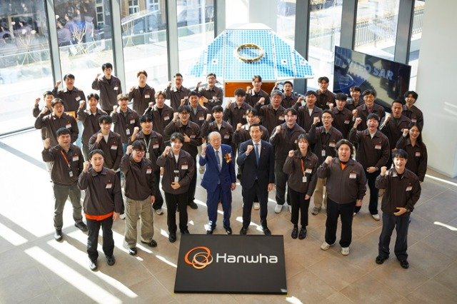 Hanwha Group Chairman Kim Seung-yeon and Vice Chairman Kim Dong-kwan take a commemorative photo with Hanwha System's Jeju Space Center executives and employees in front of a real model of the VLEO UHSAR satellite. (Source: Hanwha)