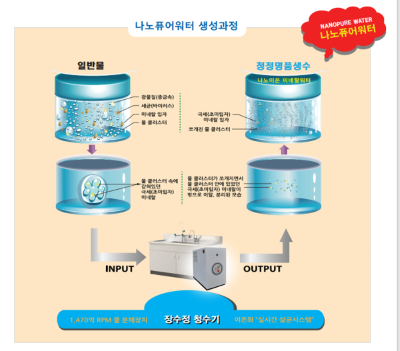 (주)한국분자력의 '나노퓨어워터'생성장치인 '장수정 청수기'는 를 한마디로 말하면 물을 나노화하여 물과 또 그 물속에 녹아 있는 인체에 유익한 미네랄 성분을 극세화하여 체내 흡수율을 극대화해주는 장치이다. 물과 또 유익한 미네랄 성분을 인체가 쉽게 흡수할 수 있도록 하여 신진대사와 혈액순환을 촉진하고 장운동을 원활하게 하는 등 건강한 신체를 유지시켜주는 데 도움을 주는 장치라는 말이다.