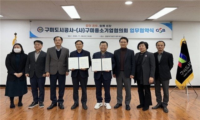 (전국= KTN) 김도형 기자= (사)구미중소기업협의회(회장 송원호)는 구미도시공사(사장 이재웅)와 23년 11월29일 오후 2시 구미도시공사에서 업무협약을 체결하고 상호협력을 통한 협약 당사자의 발전을 도모하고, 중소기업의 ESG경영 구축을 위한 역량 및 경쟁력 강화 지원과 구미도시공사와 (사)구미중소기업협의회의 데이터,시설,장비등의 이용을 협력하고 공동 노력하기로 합의했다.